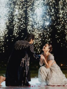 संगीत सेरेमनी में दोनों की एंट्री भी बेहद खास थी। ओपन कार में साथ बैठे हुए जब वे वेन्यू पर पहुंचे तो हर किसी की नजरें उन पर टिक गईं। चेहरे पर मुस्कान और आंखों में खुशी साफ दिखाई दे रही थी।
