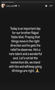 सोनू सूद ने इंस्टाग्राम पर स्टोरी डालकर लिखा है कि ‘आज हमारे राजपाल यादव भाई के लिए अहम दिन है। दुआ करता हूं कि चीजें सही दिशा में आगे बढ़ें और उन्हें राहत मिले, क्योंकि वो इसे डिजर्व करते हैं। वो रेयर टैलेंट हैं और शानदार इंसान हैं। इस मोमेंट को बर्बाद न किया जाए, हम राजपाल के साथ खड़े हैं और आगे भी रहेंगे, जब तक चीजें सही न हो जाएं।’